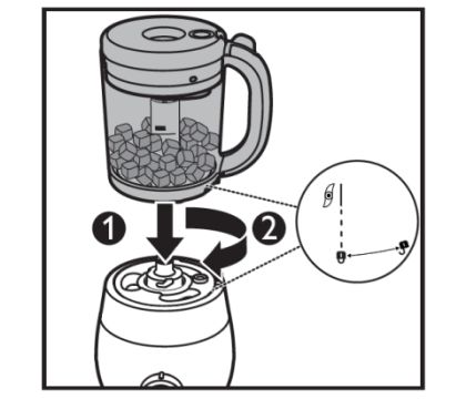 - 용기가 본체에 단단히 고정될 때까지 용기를 시계 방향으로 돌립니다. 용기의 '블렌딩' 아이콘과 본체의 '고정' 아이콘이 나란히 일치하도록 용기를 시계 방향으로 끝까지 돌린 후 핸들 아래의 홈이 고정 영역에 꼭 들어맞는지 확인합니다.