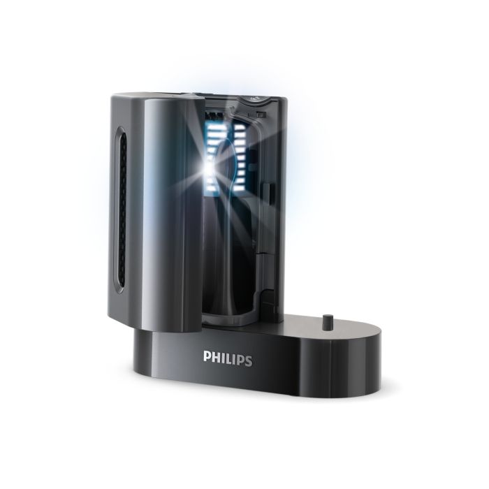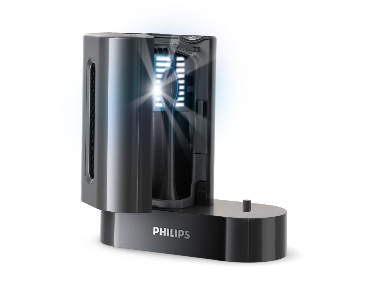 특별히 설계된 필립스 UV 살균 기술로 소닉케어 칫솔모를 깨끗하게 유지하세요. 칫솔모의 세균을 살균하기 위해 특별히 설계된 UV 살균기입니다.